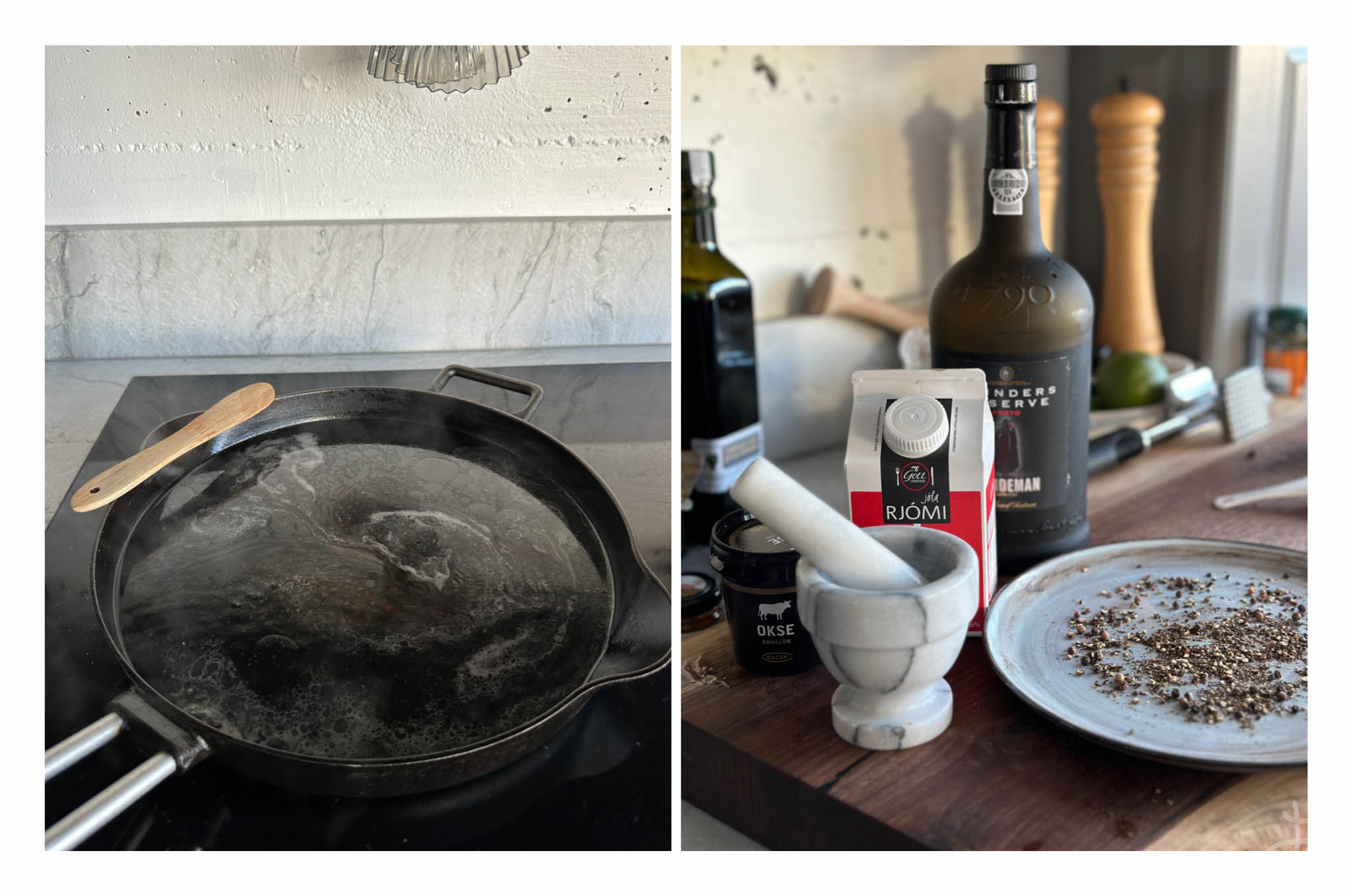 - Kjötið snyrt aðeins – sinar skornar frá. Lundin skorin í bita – gott að miða við að hver biti sé 120 – 160 g. Kjötbitar lokaðir á báðum hliðum – það má gera á heitri pönnu (ýmist á þurri pönnu eða með örlítið af olíu) eða á grilli. Mikilvægt í báðum tilfellum að hita grillið eða pönnuna mjög vel. Pipar settur á hliðarnar – fyrir þá sem vilja. Gott að setja mulinn pipar á lítinn disk og nudda hliðunum ofan í