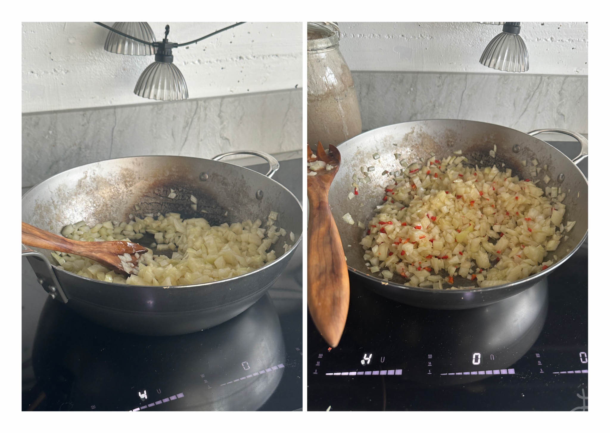 - Olía og smjör sett í pott – laukur látinn malla í u.þ.b. 5 mínútur á meðalhita. Chilipipar og hvítlauksrifi bætt við – látið malla á vægum hita í nokkrar mínútur