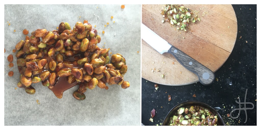 Kakan sett á kökudisk, mascarponekrem sett frjálslega ofan á, karamellusósunni hellt yfir og pistasíukurli dreift yfir