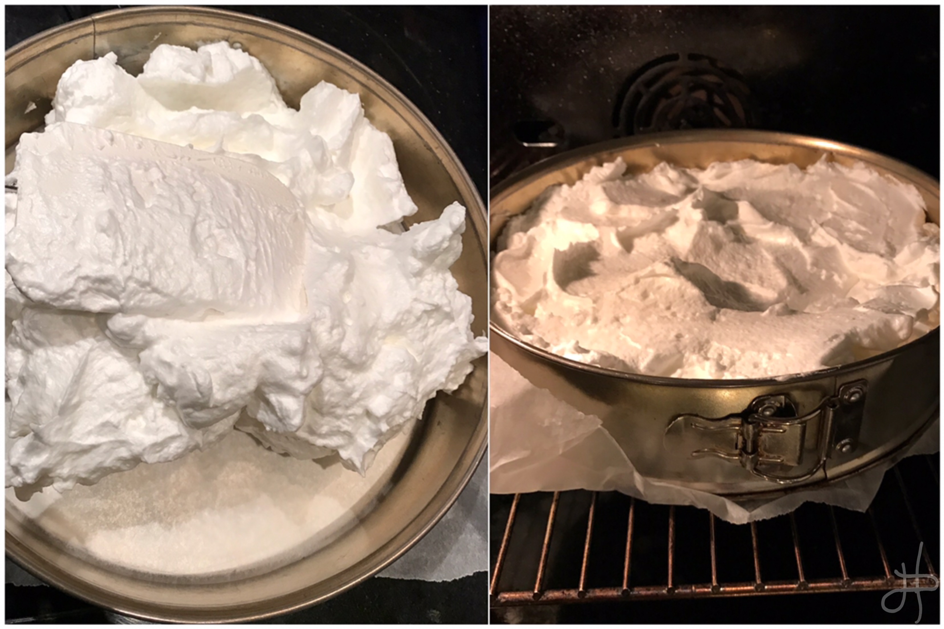- Marengsbotninn settur á kökudisk og fyllingin ofan á hann